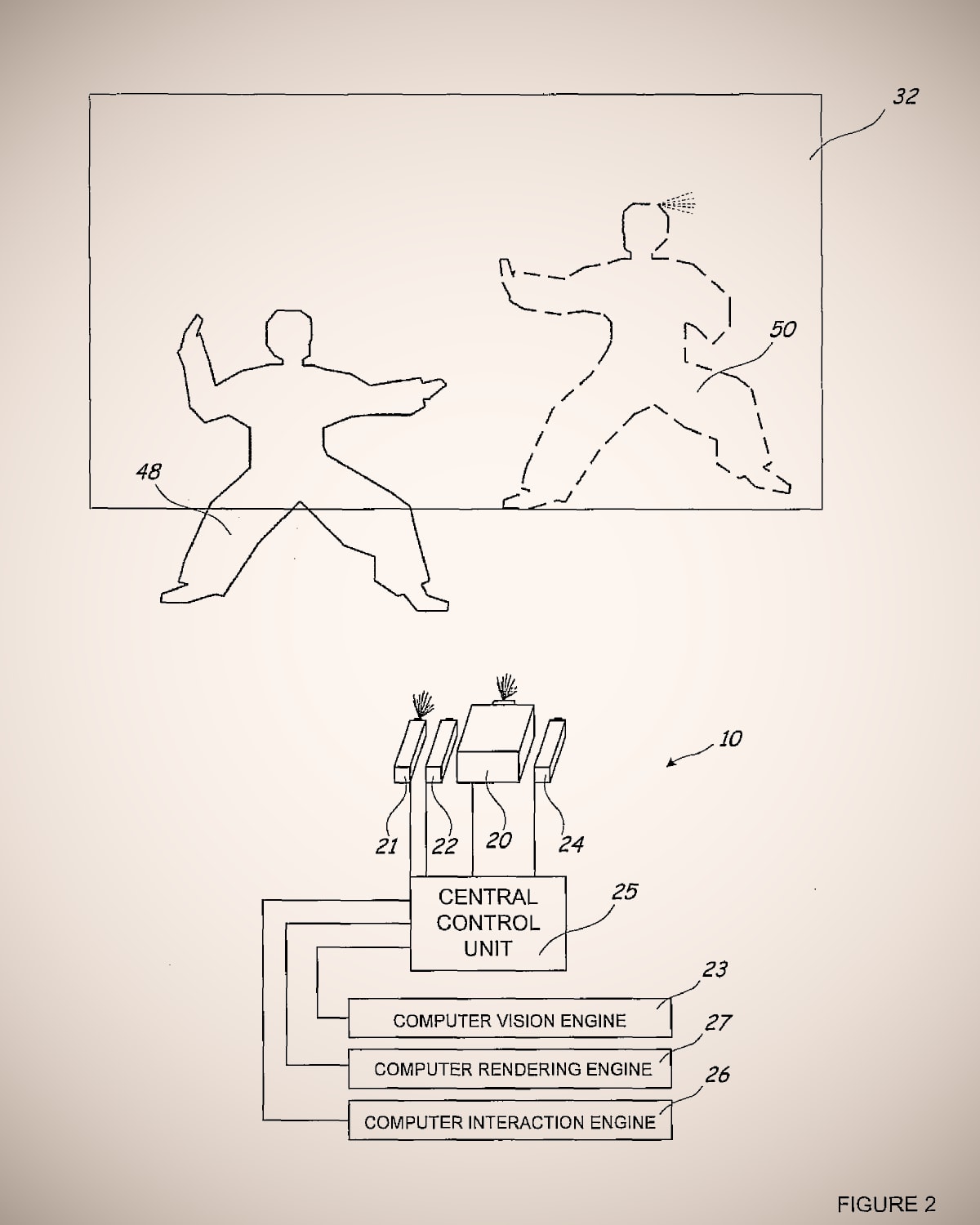 This invention, and its continuations, sit at the essence of the PlayMotion System which Matt, Suzanne, Jeremy and I pioneered from 2003-2009. The basic premise was a projector/camera system (thank you Raskar, Fuchs, Utterback), where the actual lightspeed optical shadow of the player(s) within the playspace served as the avatar. Optical shadows hold massive advantages over digitally rendered avatars: they are literal zero-latency (speed of light), they are infinite resolution (far greater than 4k), and they are monochrome (pure black), allowing the player to use their imagination and environmental context to map whatever character / archetypes they want upon the image.