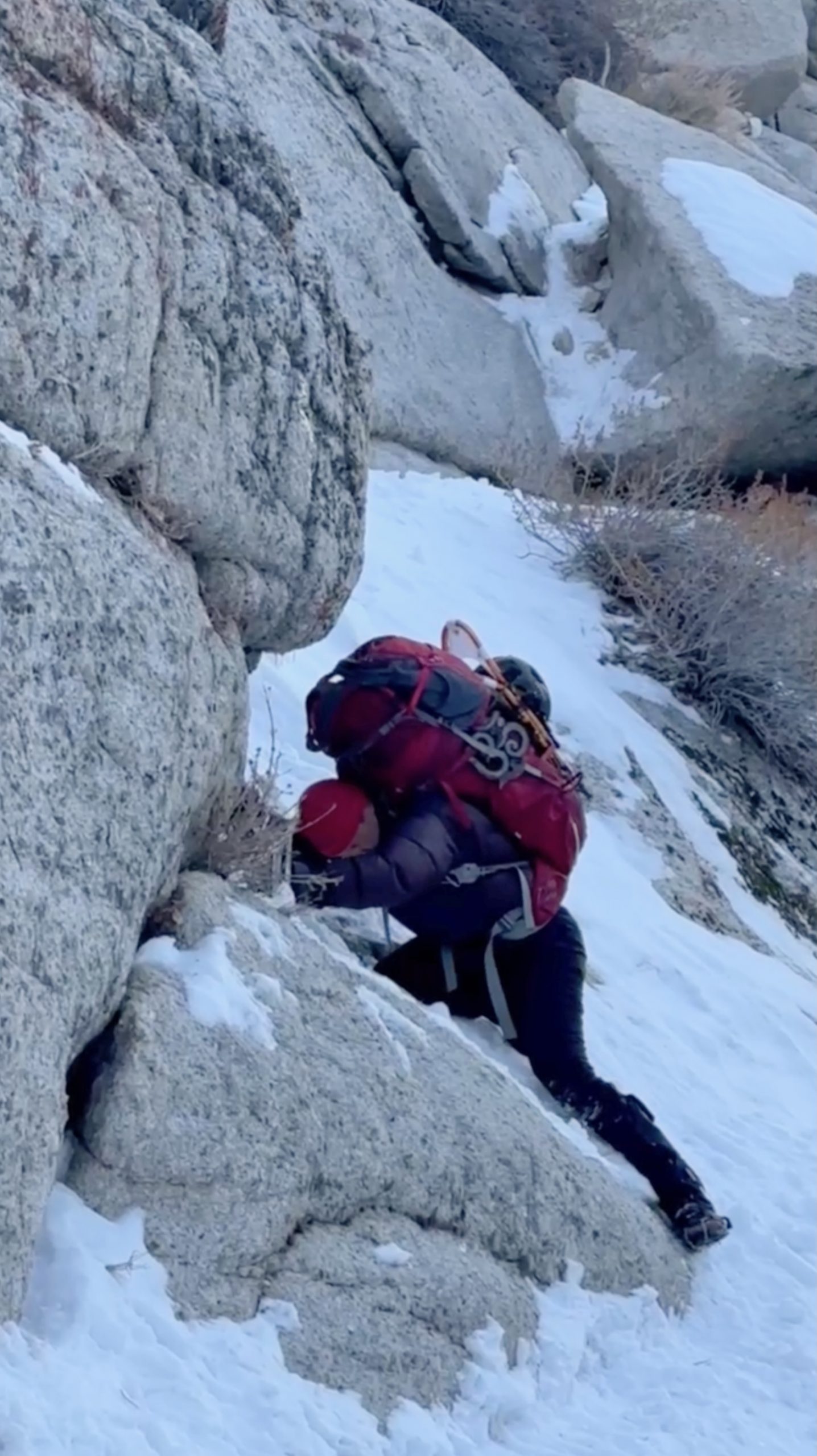 - the navigation is sketch. the cliffside blocks many GPS signals, and it is hard to tell where you are on the trail. as with most of whitney mountaineers ruote, the trail is for guidance only, you can really “choose your own adventure”… but on the e-ledge portion, ledges can very easily dead end into serious technical climbing (5.10+) cliffs that would be unwise to free solo, esp. with a heavy pack on your back. even in the video linked here, filmed in clear summer day without snow, they miss the cairns. so just go slow, always note your exposure, and be careful and be ready to track back.